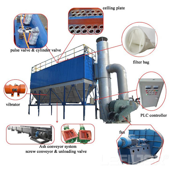 Due to the inertia, the coarse particles in the gas will fall into the ash bucket, and the fine dust particles will go up along with the gas and into the filtering chamber.