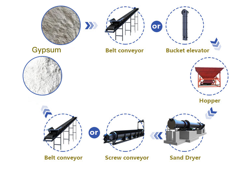The gypsum is sent to the hopper by a belt conveyor or bucket elevator, and then enters the feeding end through the feeding pipe through the feeding machine of the hopper.