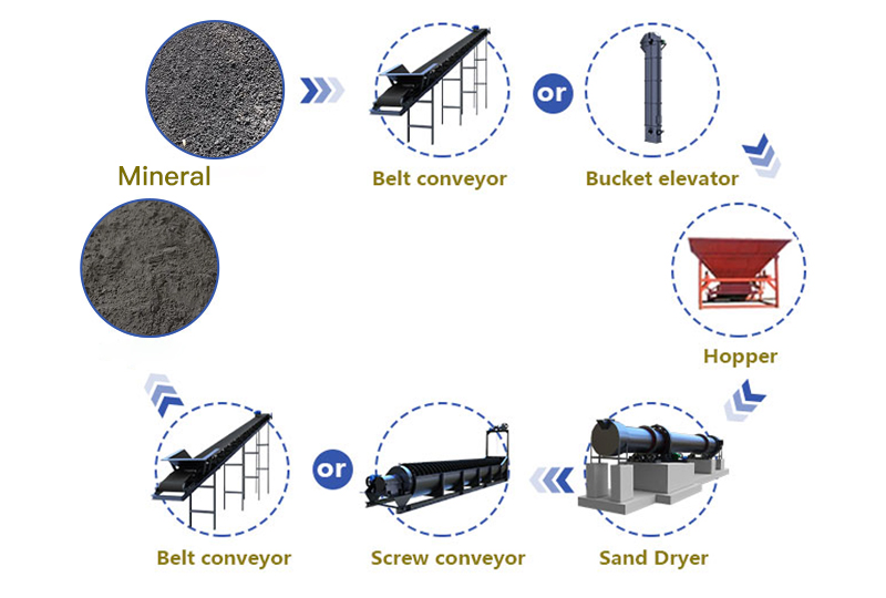 The mineral is sent to the hopper by a belt conveyor or bucket elevator, and then enters the feeding end through the feeding pipe through the feeding machine of the hopper. The material is added from the higher end, and the heating medium enters from the lower end, and is in countercurrent contact with the material. When the wet material moves forward in the cylinder, it directly or indirectly receives heat from the heating medium, so that the wet material can be dried, and then sent out through a belt or screw conveyor at the discharge end. In addition, dust collectors can also be used to reduce dust in the drying system.